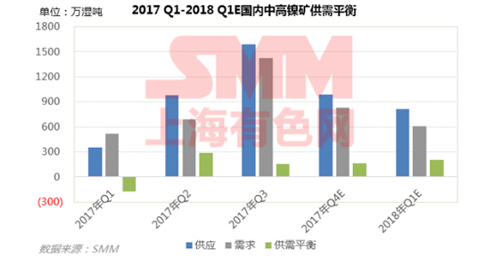 2017年4季度國(guó)內(nèi)中高鎳礦維持供應(yīng)過剩,而2018年1季度情況加劇,供應(yīng)過剩209萬(wàn)濕噸,SMM預(yù)計(jì)鎳礦價(jià)格仍弱勢(shì)。
